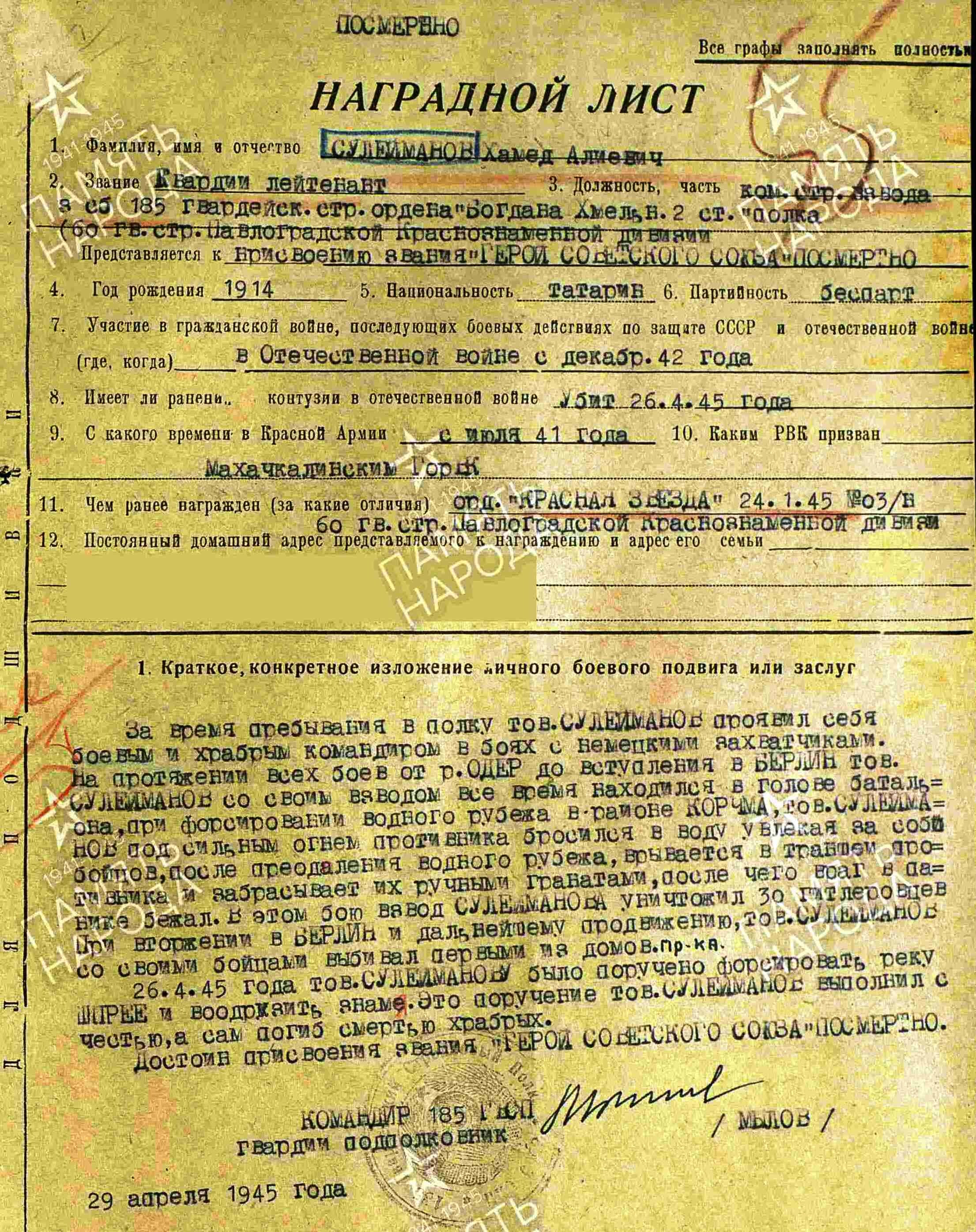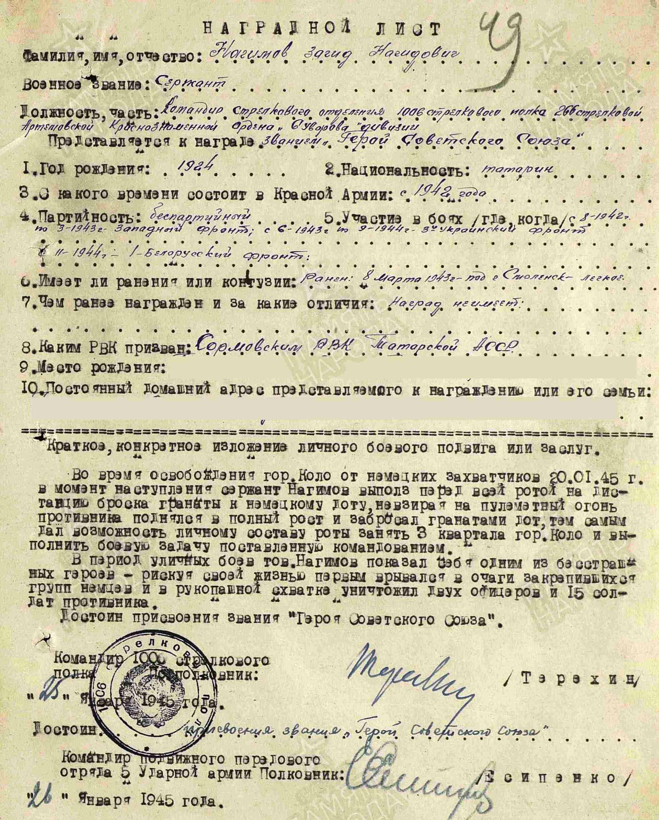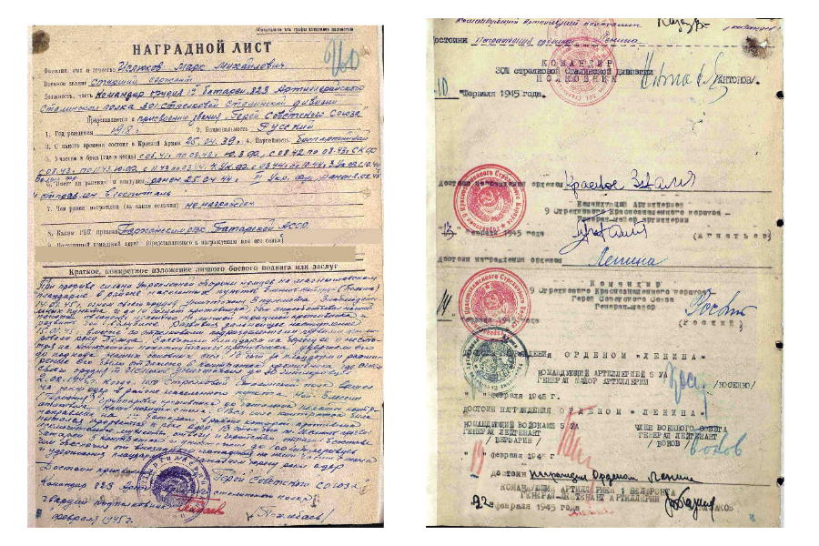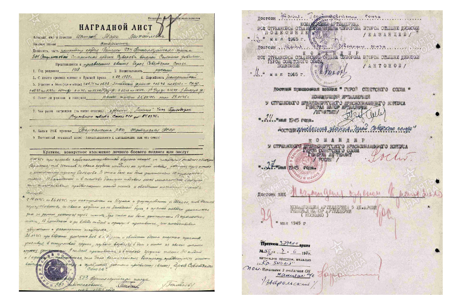 Представлен к званию Героя командиром 823 артиллерийского полка гвардии подполковником Похлебаевым 5 февраля 1945 г.