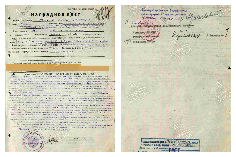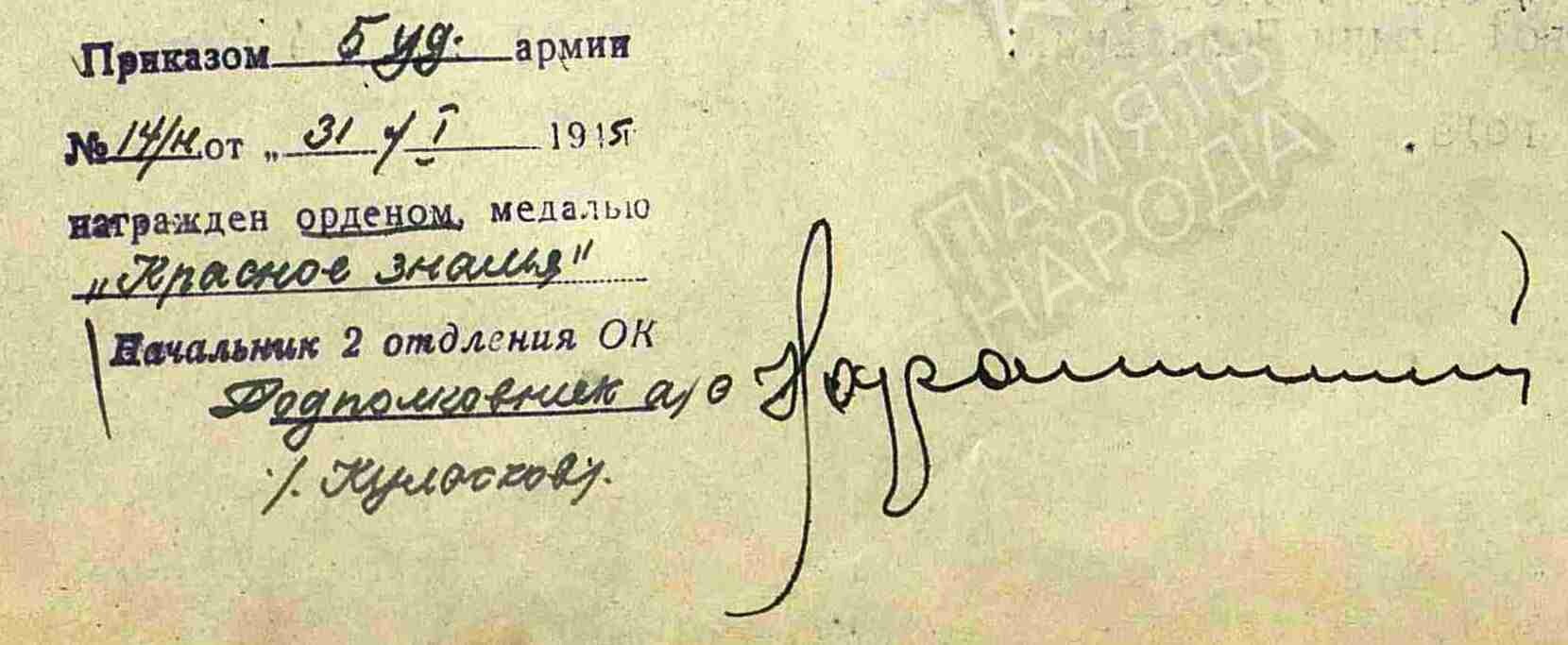 Из наградного листа: «14 января 1945 г при прорыве обороны противника на магнышевском плацдарме в районе н.п. Еленов Выбруй в Польше огнем своего орудия уничтожил 3 пулемета. 3 наблюдательных пункта и до 10 гитлеровцев. 15 января при развитии наступления форсировал реку Пилица участвовал в захвате плацдарма и удержании его от 6 контратак. При этом уничтожил до 30 пехотинцев. 2 февраля при форсировании реки Одер в районе н.п. Ной-Блессинов в Германии участвовал в отражении 5 контратак и уничтожил до 100 гитлеровцев. Плацдарм был удержан.»
