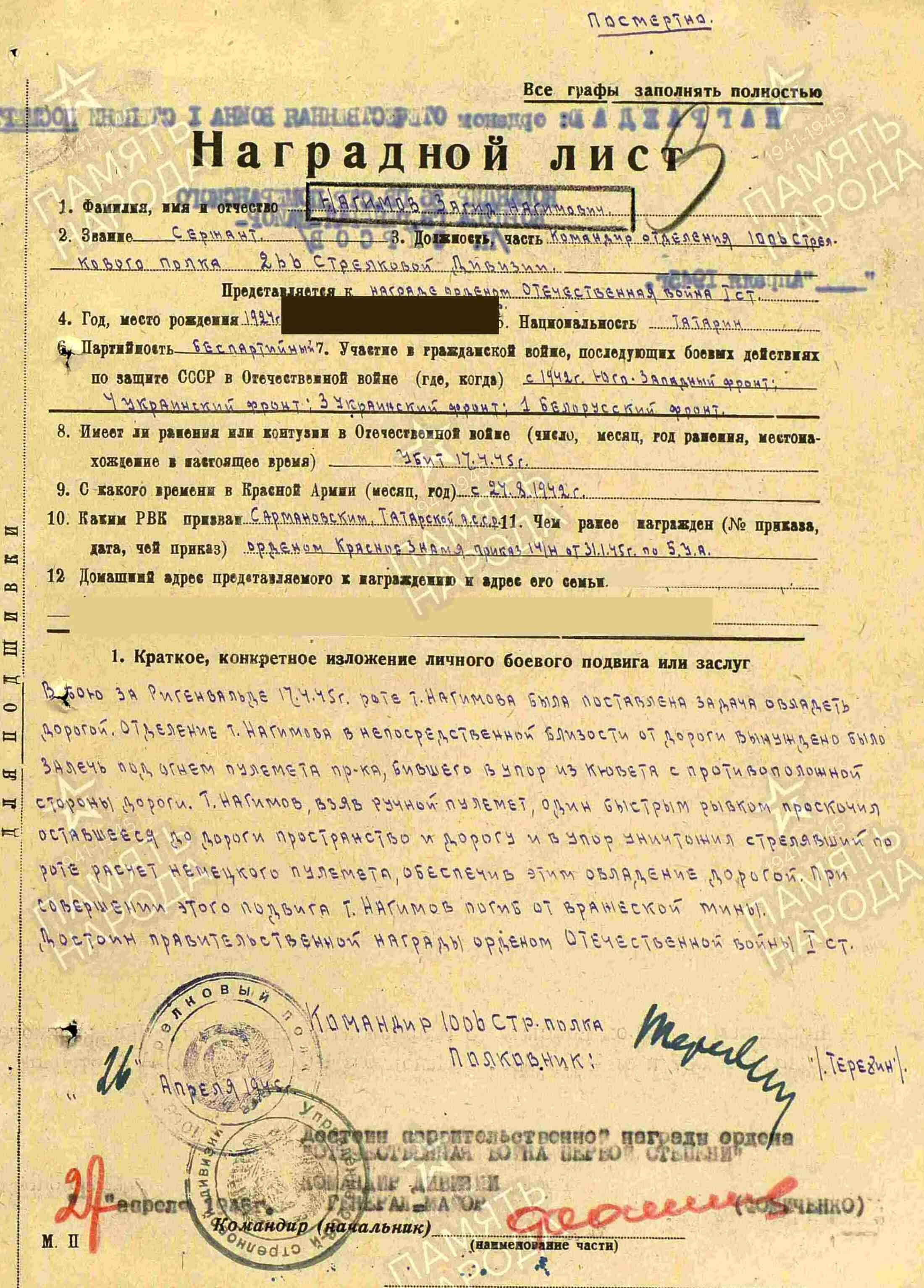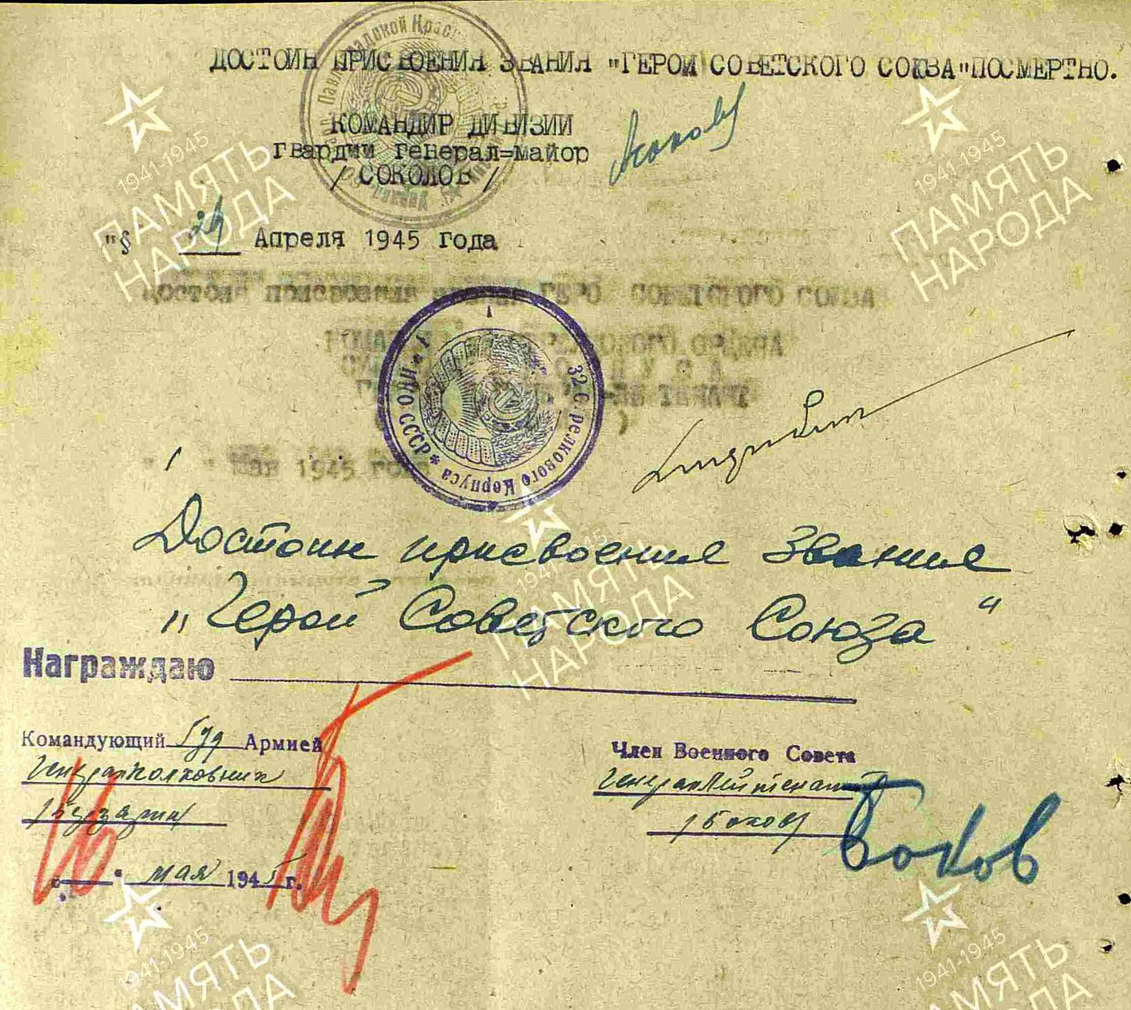 К званию Героя представлен посмертно 1 мая апреля 1945 г. командующим 5 ударной армией генерал-полковником Берзариным. Из наградного листа: “При форсировании реки Одер в районе нас. пункта Корчма одним из первых бросился в воду, увлекая свой взвод. Преодолев преграду, ворвался во вражеские траншеи, забросал их гранатами, уничтожил 30 гитлеровцев. Первым выбивал фашистов из домов в г. Берлине. 24 апреля 1945 г. форсировал реку Шпрее и при попытке установить красное знамя около моста на левом берегу, на ул. Георгия-Штрассе в г. Берлине погиб 26 апреля.”