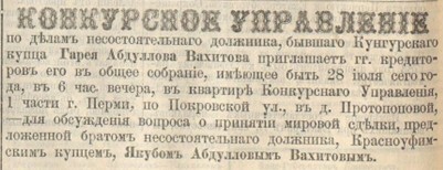 В течении года Конкурсным управлением Перми проводилась “публичная продажа разного мануфактурного товара”, трёх лошадей, одной зимней повозки, принадлежащих Гарею Абдул Вахитову.