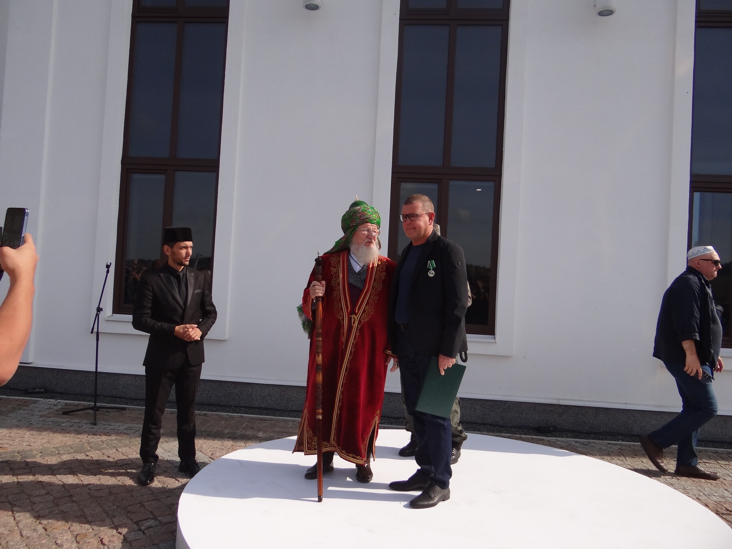 Почетный гость вручил мечети знамя с надписью на арабском языке. А спонсора строительства мечети Гамаля Рафаиловича Замалетдинова наградил орденом «За заслуги перед Отечеством».