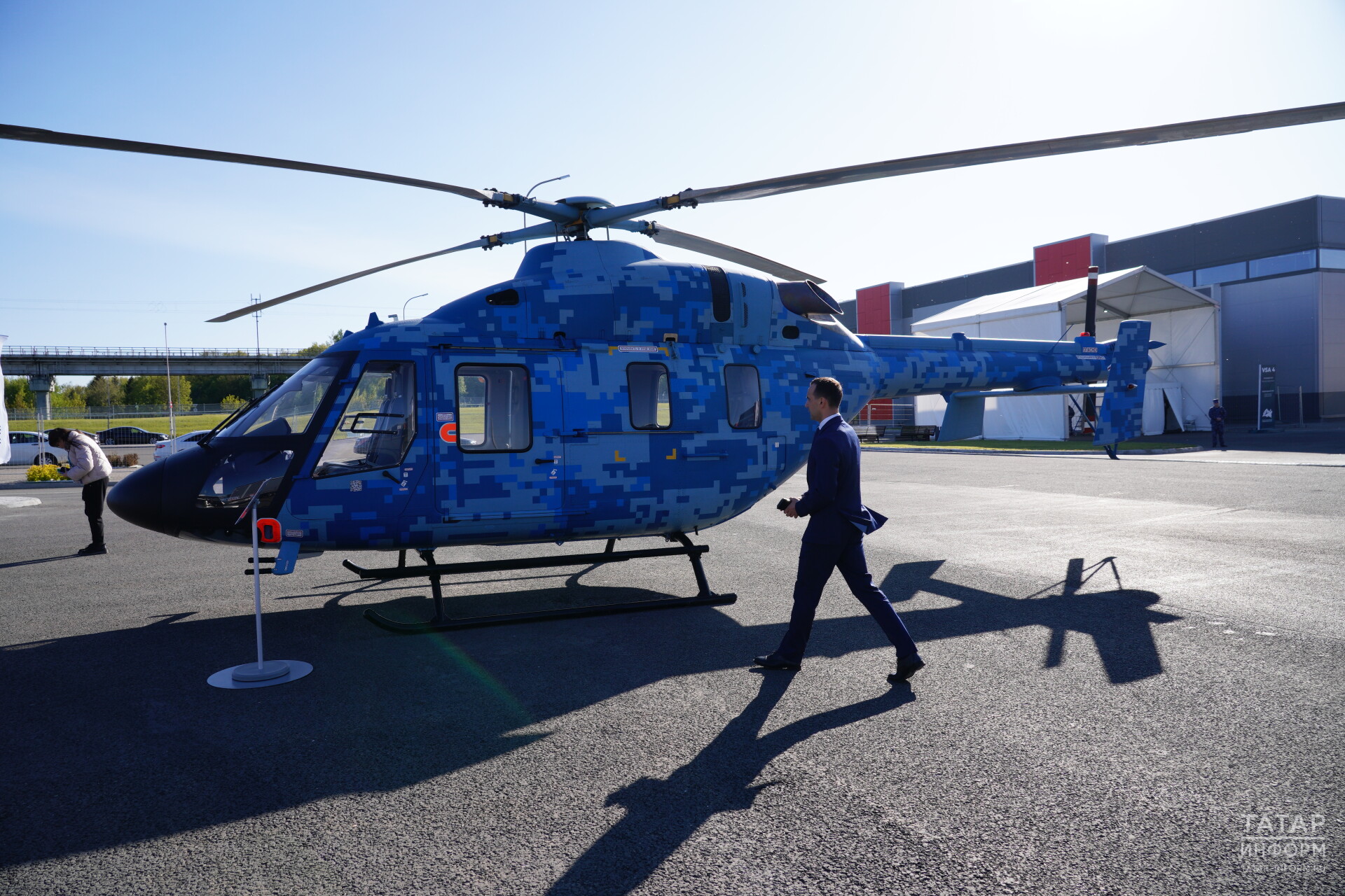 Затем Раис Татарстана и вице-премьер РФ отправились на улицу, где выставили различную технику. В самом начале красовался вертолет «Ансат», сделанный на Казанском вертолетном заводе. Марат Хуснуллин не удержался и залез внутрь, проверяя интерьер машины.